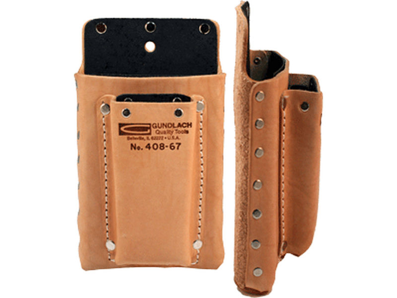 Combines a No. 408 and a No. 67 Pouch into one. Both pockets are fiberboard lined for protection. Has belt slots in the leather behind the fiberboard liner.