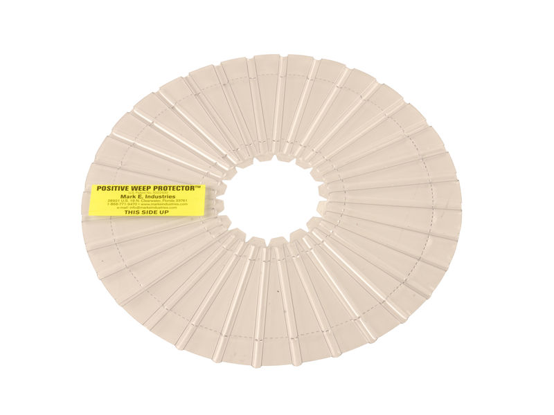 This patented clear plastic drainage disk is for placement around a drain opening in a shower floor. Designed to be positioned between the floor pan and the mortar laid over the floor pan. The ridges of the Positive Weep Hole Protector allow for drainage of water to the weep holes in the drain receptor. Helps prevent water from sitting between the shower pan liner and mortar bed. The inner and outer diameter of the disk are perforated to allow for customization depending on shower drain size.