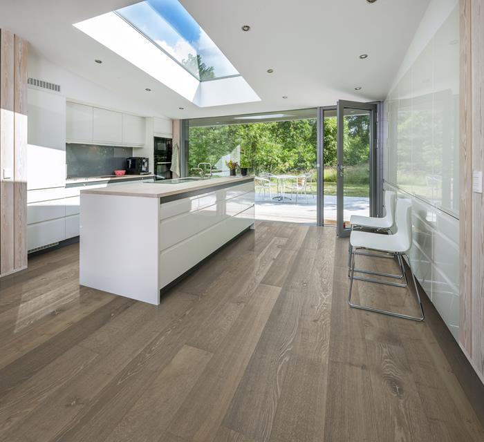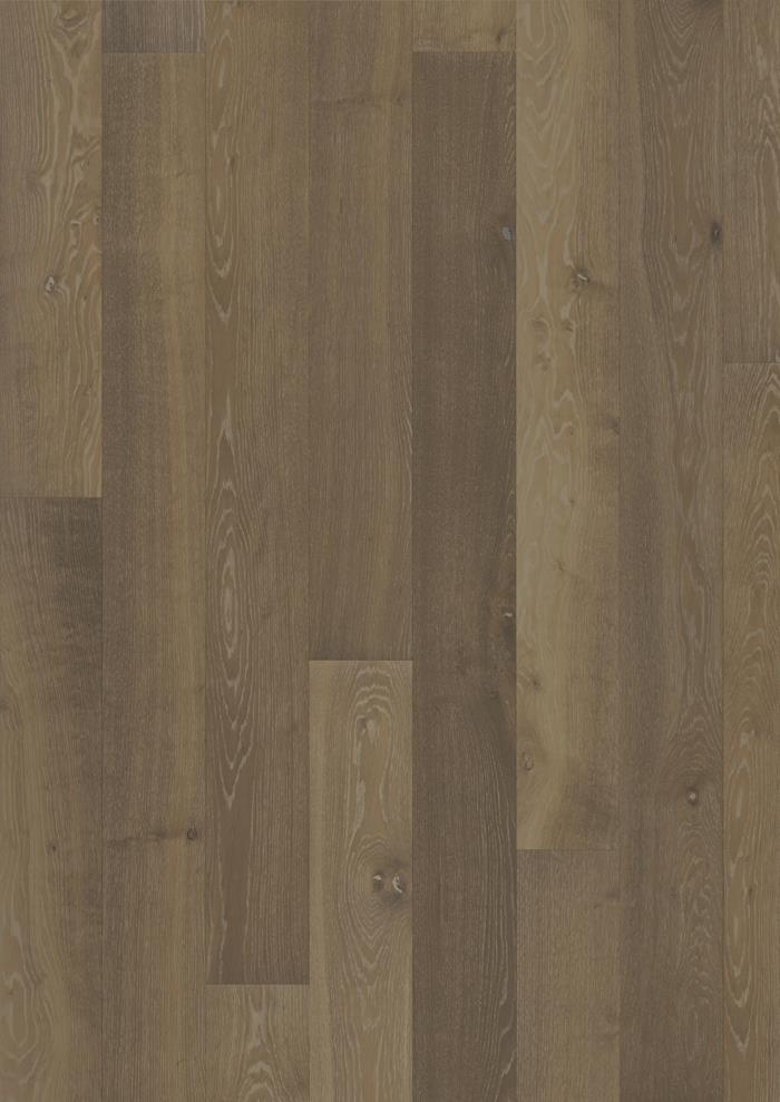 The lightly smoked, grey-stain found on this single-strip oak floor from the Classic Nouveau Collection enhance the earth undertones and balance the natural contrasts in the wood. Knots and cracks lightly pepper the boards, adding subtle depth to the floor’s elegant expression. Each board is carefully brushed to bring out the character of the grain and highlight the natural texture of the wood. Four-sided micro-bevelling at the edges ensures a classic full plank look and feel. The matt lacquer finish eliminates glare while protecting the wood from daily wear.