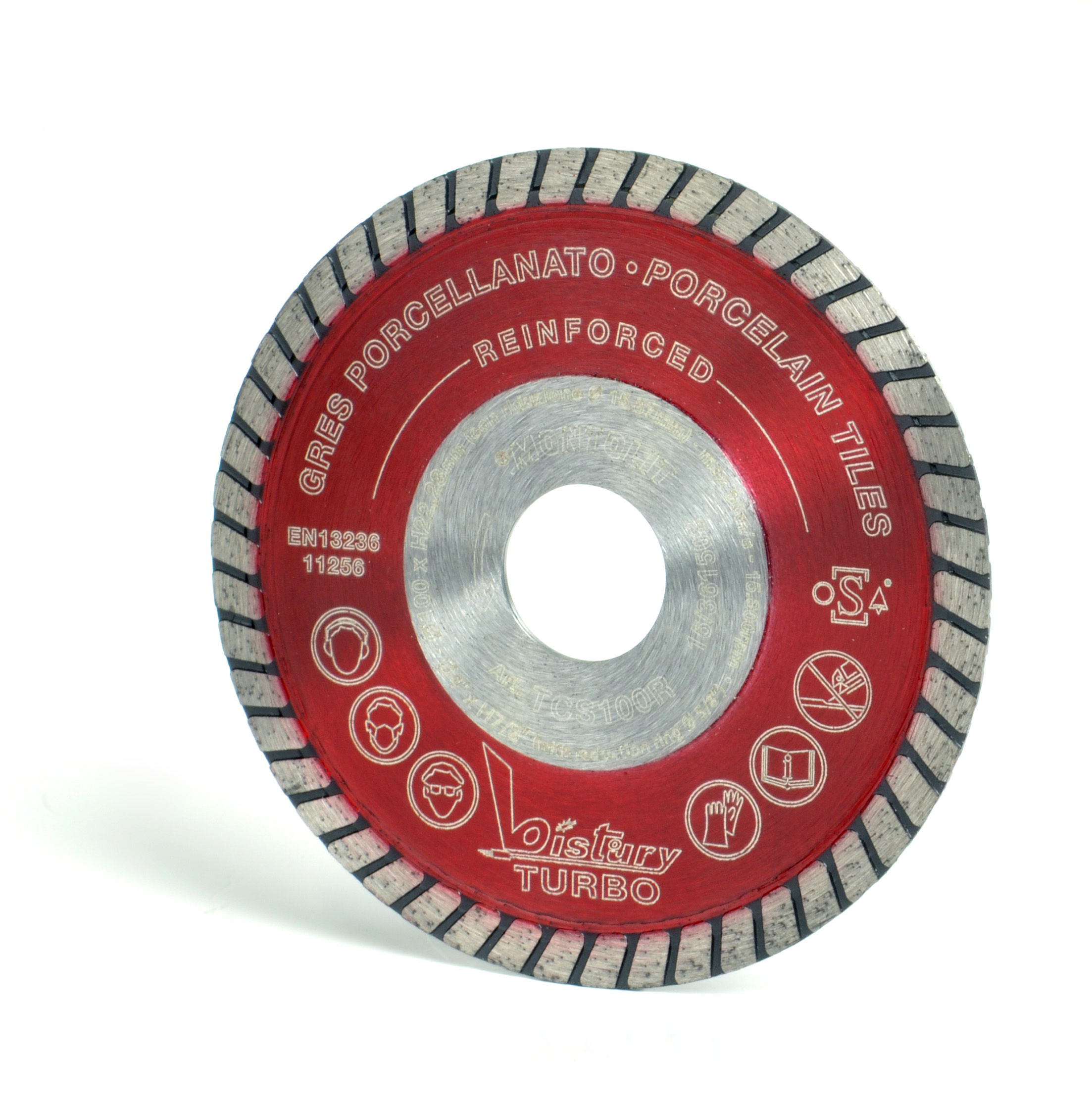 Continuous diamond blade from the TCS-R series, Turmont Red Line “Professional”. Thickness 1.4 mm, arbor 22.2 mm. For cutting vitrified stoneware or compact ceramics. Compatible with wet cutting and dry cutting.