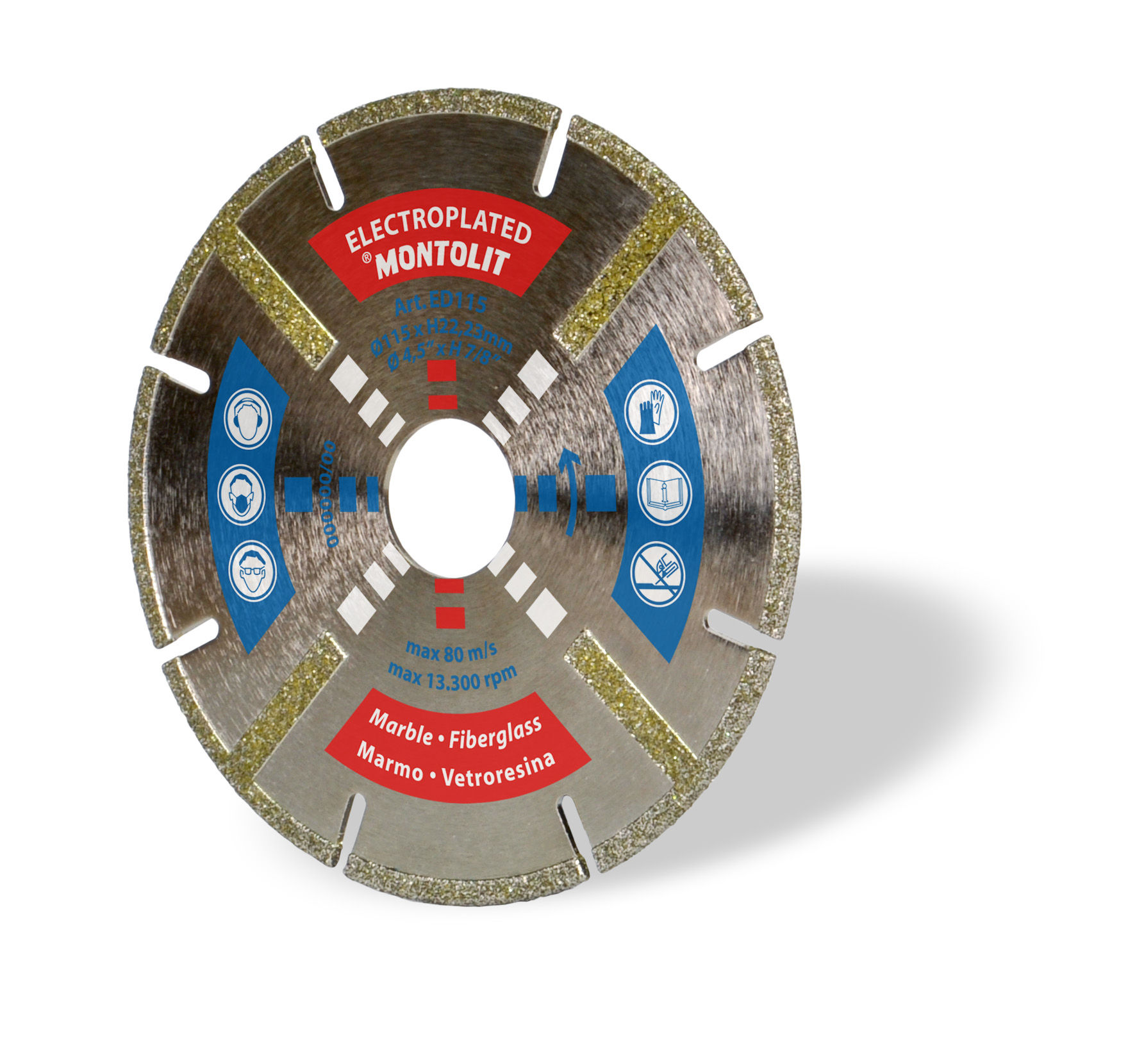 Segmented diamond blade from the ED series, Electroplated Silver Line “Top”. 22.2 mm arbor. For cutting marble and fiberglass. Compatible with wet cutting and dry cutting.