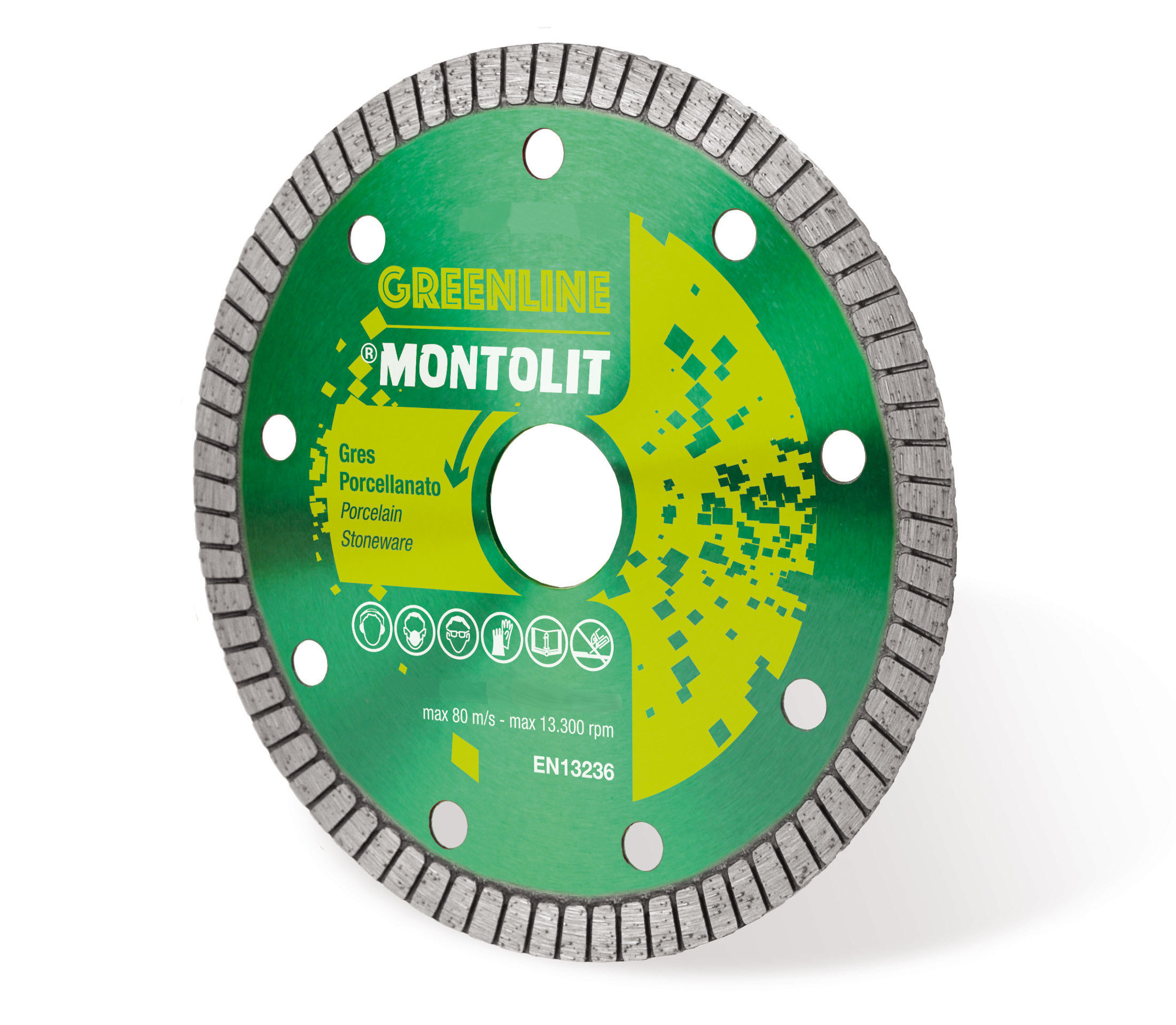 Continuous diamond blade from the TCS-E series, Turmont Green Line “Basic”. Thickness of 1.4 mm, arbor of 22.2 mm. For cutting vitrified stoneware or ceramic. Compatible with wet cutting and dry cutting.