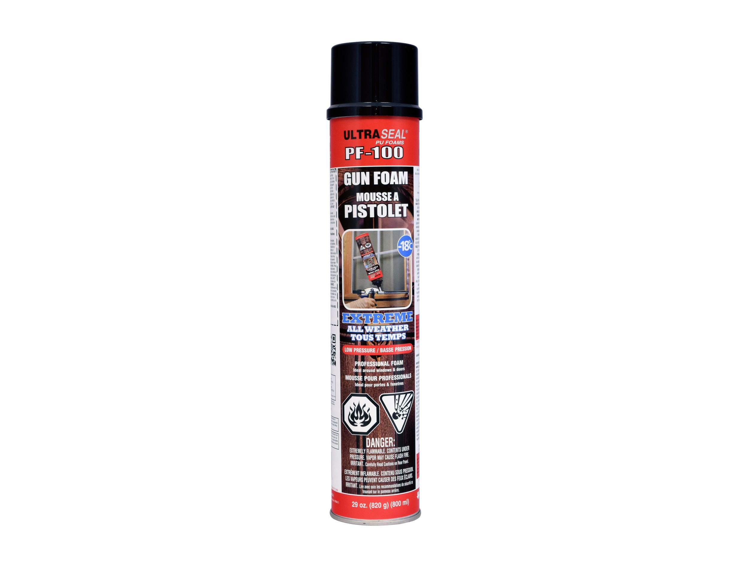 UltraSeal PF-100 Gun Foam is an All-Weather, low expansion, UL classified, one-component polyurethane foam designed for use in extreme temperatures and low humidity conditions, general sealing of gaps, holes and crevices. This foam is for use with any one of the UltraSeal Professional Foam Dispensers.
