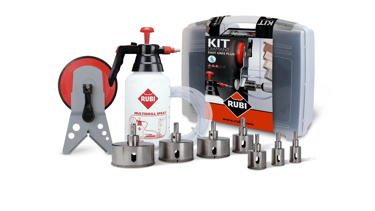 In addition to these practical kits, RUBI also offers the EASYGRES PLUS kit consisting of: 7 EASYGRES drill bits (20, 28, 35, 43, 50, 68 and 75 mm diameter), a MULTIDRILL centring guide, a tank and hose unit and a practical case. Finally, and thinking of the most common use of these types of drill bits, we have the EASYGRES 35 mm kit.