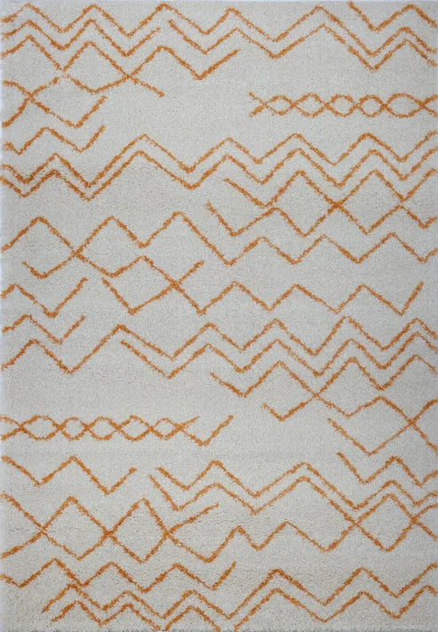 Decorate your floors with this machine made Moroccan Shag Area rug featuring authentic tribal design. This ivory orange area rug is designed with an engaging geometric pattern in orange color traditional Moroccan pattern over an ivory background. The rug is suitable for modern contemporary décor and it’s soft texture makes it suitable for any area of your home including play area or kids room. This beautiful area rug is a great affordable way to update the décor of your home while also protecting your floors. The rug is machine made from polypropylene fibers for lasting beauty and charm.